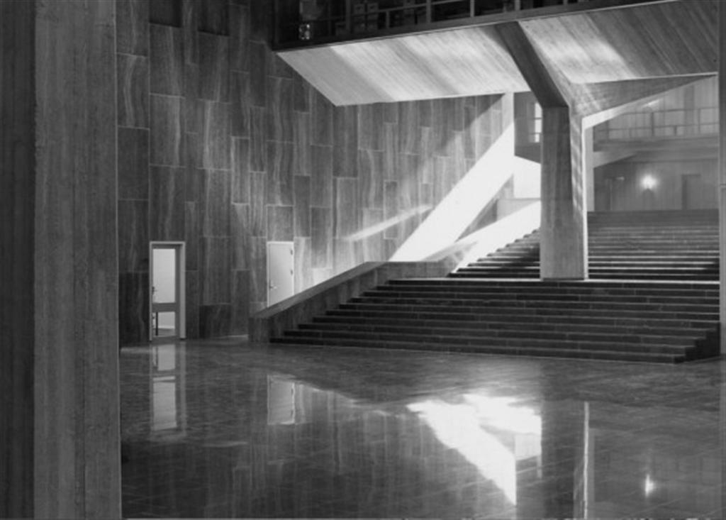 Behalve de bijzondere vorm valt in dit gebouw het materiaalgebruik op: natuursteen aan de gevels en in de hallen; schone beton als binnenwand en draagconstructie en hout als plafond. De schone beton in de hallen is gemengd met oker waardoor een door en door gekleurd materiaal is ontstaan. Aanvankelijk vreesde men en teruggang in sterkte door deze “verontreiniging”. Bij drukproeven bleek echter dat de beton er 5% sterker door was geworden.